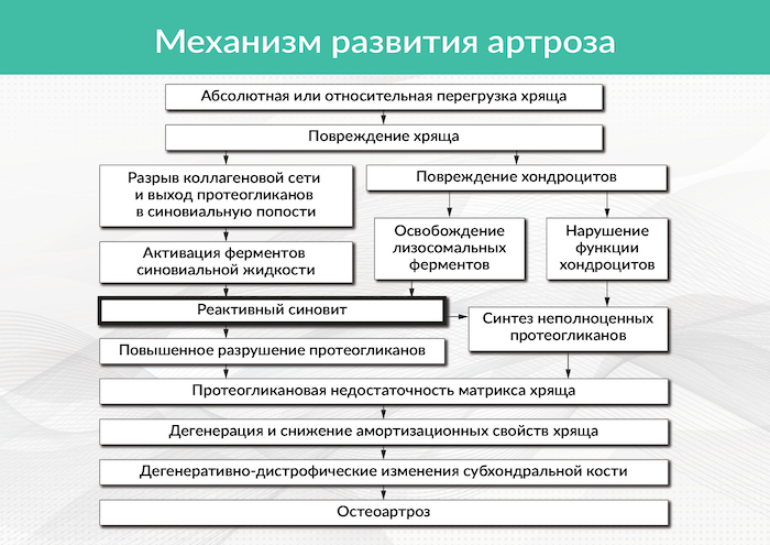 Механизм развития артроза другой. Ряд факторов приводит к разрушению и гибели клеток хряща, в то время как новые клетки не успевают заместить отмершие. Этот процесс может длиться в течение нескольких месяцев или лет, приводя к необратимым изменениям в хряще, связках, суставной сумке. Участки поврежденных клеток замещаются грубой тканью, по краям сустава начинают формироваться костные наросты (остеофиты).