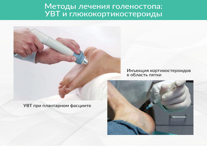 На основании своего исследования авторы сделали вывод о более высокой эффективности УВТ в купировании болевого синдрома при плантарном фасциите в сравнении с инъекционным лечением глюкокортикоидами. Можно предположить, что ударно-волновая терапия также будет эффективна и при патологиях голеностопного сустава.