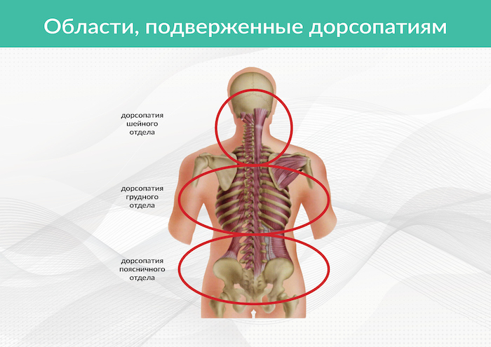 В патологический процесс могут вовлекаться все отделы позвоночного столба, но наиболее часто дорсопатии возникают в шейном, пояснично-крестцовом и грудном отделах.