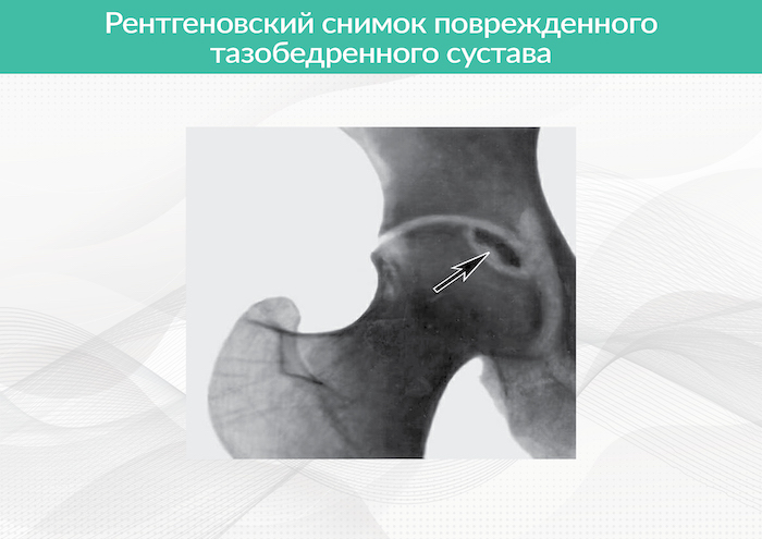 Рис. 2. На рентгенограмме - некроз головки бедренной кости (патологический участок указан стрелкой).