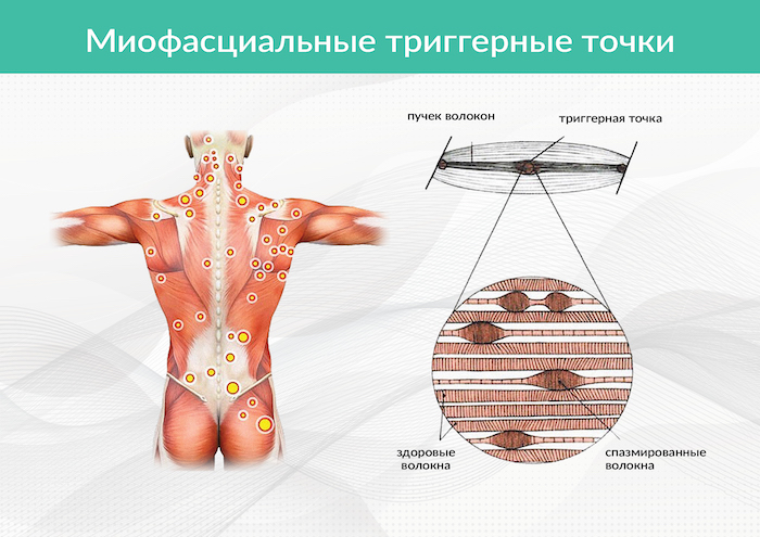Спазмированные болезненные участки мышц спины называют триггерными точками, или триггерами. Для этих патологических зон характерна как локальная болезненность, так и отраженная, отдающая в другие участки тела. Гистологическая картина выявляет участки сокращенных мышечных волокон. Такая длительная перегрузка способствует выбросу биологически активных веществ, которые воздействуют на болевые рецепторы, тем самым провоцируя развитие болевого синдрома.