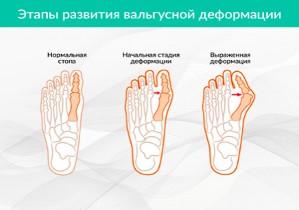 Под действием вышеназванных факторов происходит постепенно расхождение плюсневых костей первого и второго пальцев. Плюсневая кость отклоняется кнаружи, а фаланги большого пальца – внутрь. Плюснефаланговый сустав деформируется. При ходьбе происходит его постоянное травмирование, что провоцирует развитие бурсита. Суставная сумка воспаляется, начинается обызвествление тканей и образование костного нароста в ее толще. Боли при вальгусной деформации постоянные, сильные, сустав отечен, кожа над ним гиперемирована.