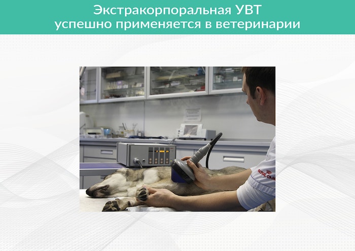 Ветеринары из Бразилии провели исследование по изучению эффективности УВТ при остеоартрозах тазобедренных суставов у собак. Животные получили 3 процедуры с интервалом в 1 неделю. После окончания лечения отмечено уменьшение болезненности, восстановление физической активности. Собаки перестали хромать.