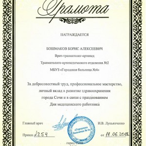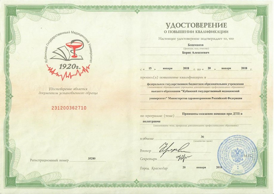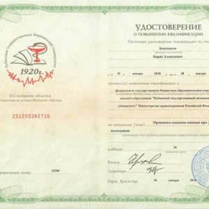 - 2018 – повышение квалификации по циклу «Принципы оказания помощи при ДТП и политравме»