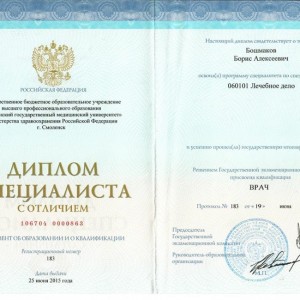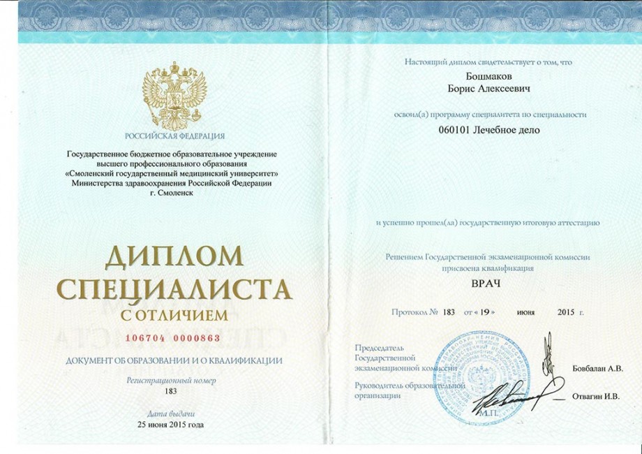 - 2015 – окончил с отличием Федеральное государственное бюджетное образовательное учреждение высшего образования "Смоленский государственный медицинский университет " Министерства здравоохранения Российской Федерации
