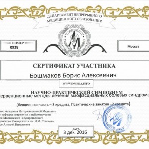 - 2016 – «Интервенционные методы лечения миофасциальных болевых синдромов» на базе ФГАОУ ВО Первый МГМУ им. И.М. Сеченова Минздрава России