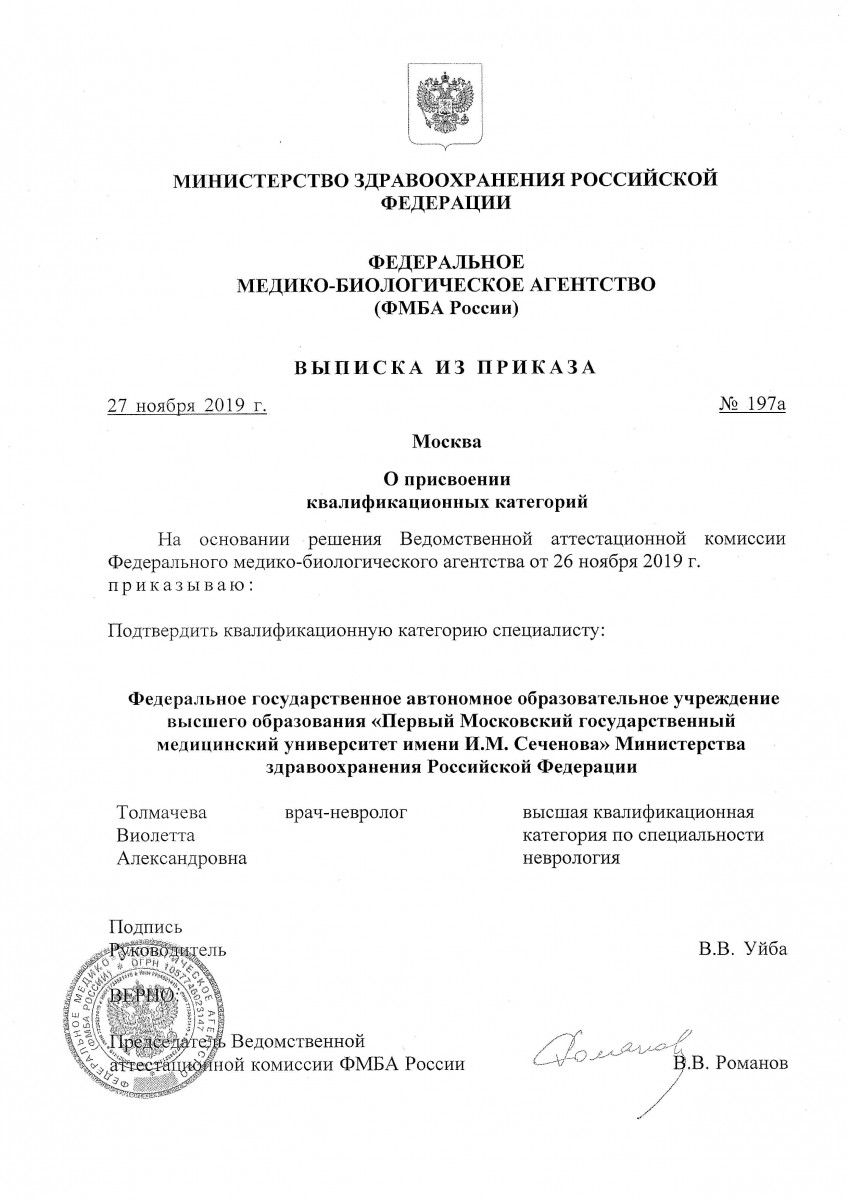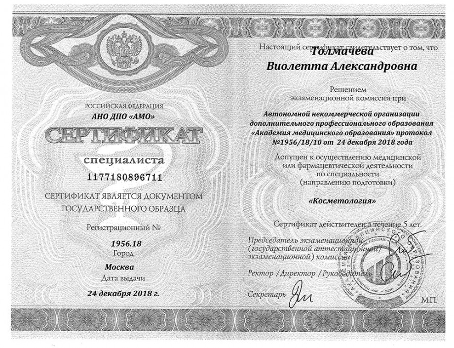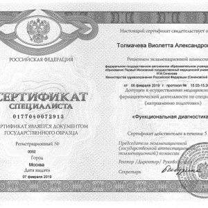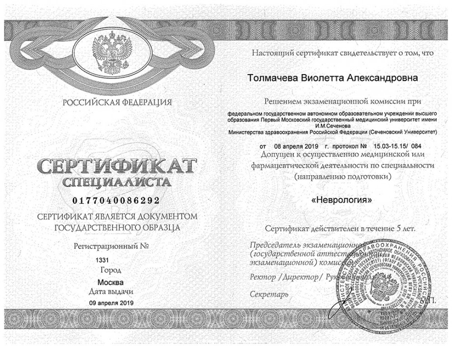 Имеет сертификаты врача-невролога, врача-рефлексотерапевта, врача функциональной диагностики, сертификаты на право использования в клинической практике препаратов ботулотоксина типа А